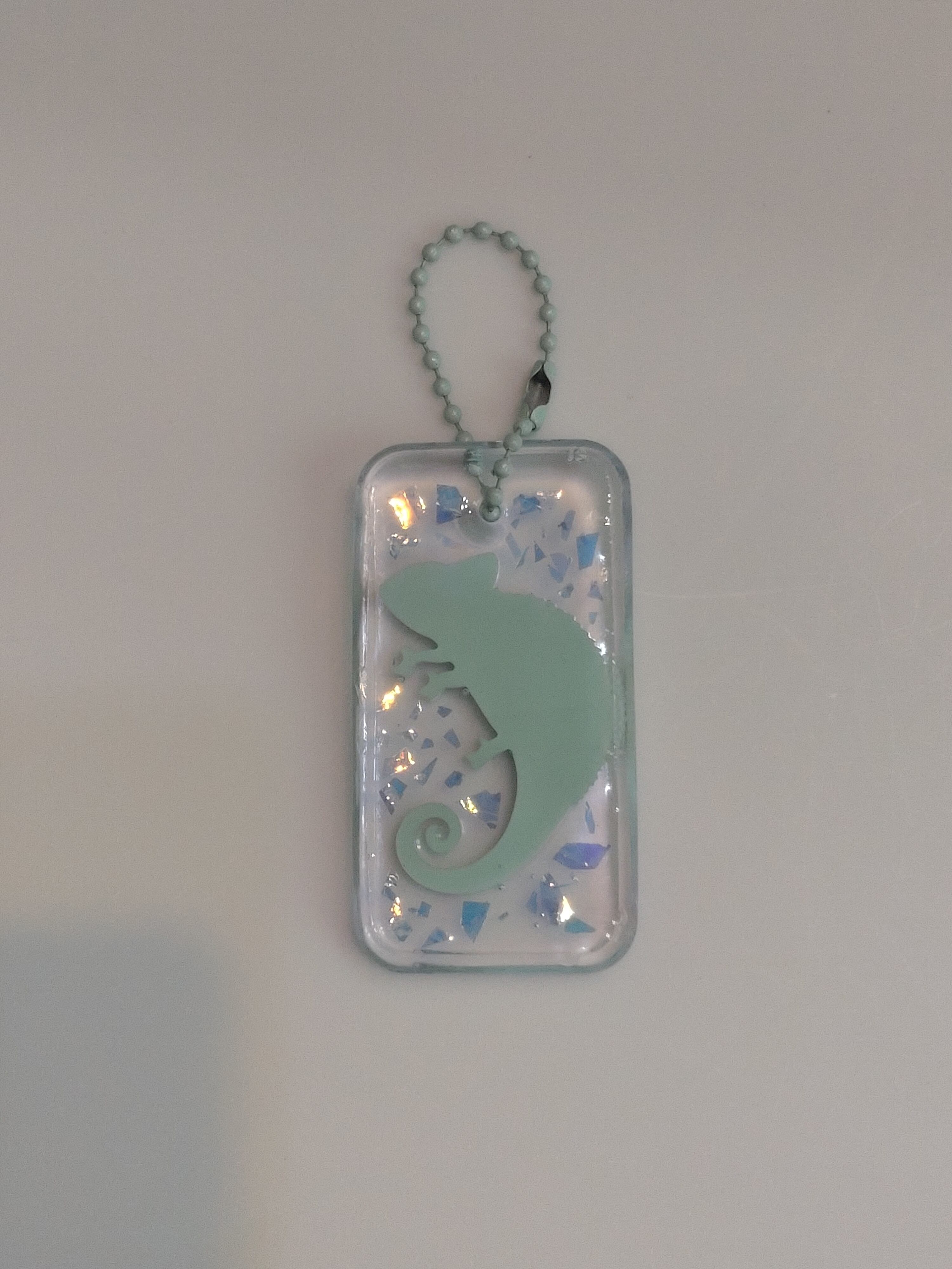 カメレオンのキーチェーンにオーロラフィルムが輝きます。