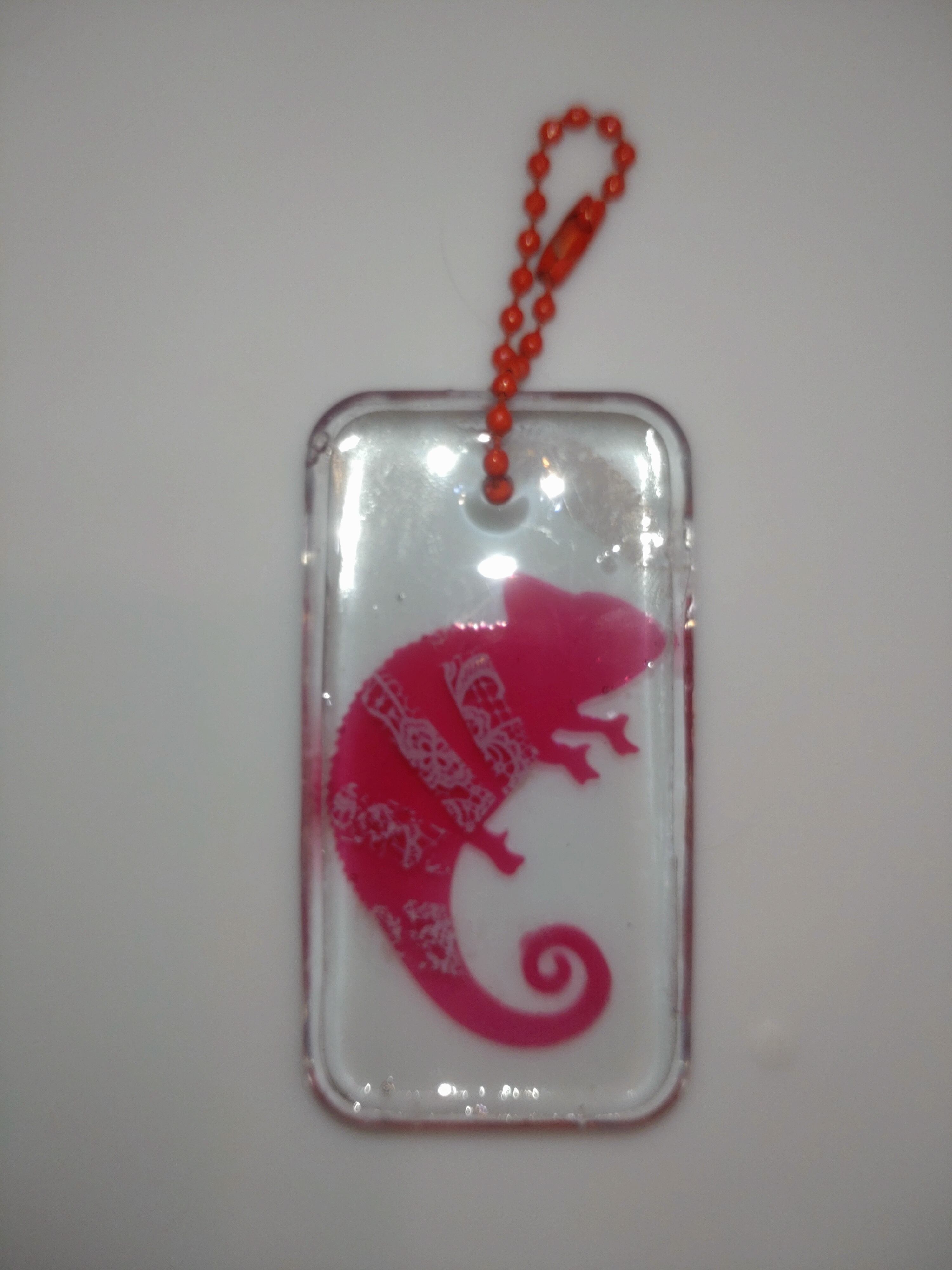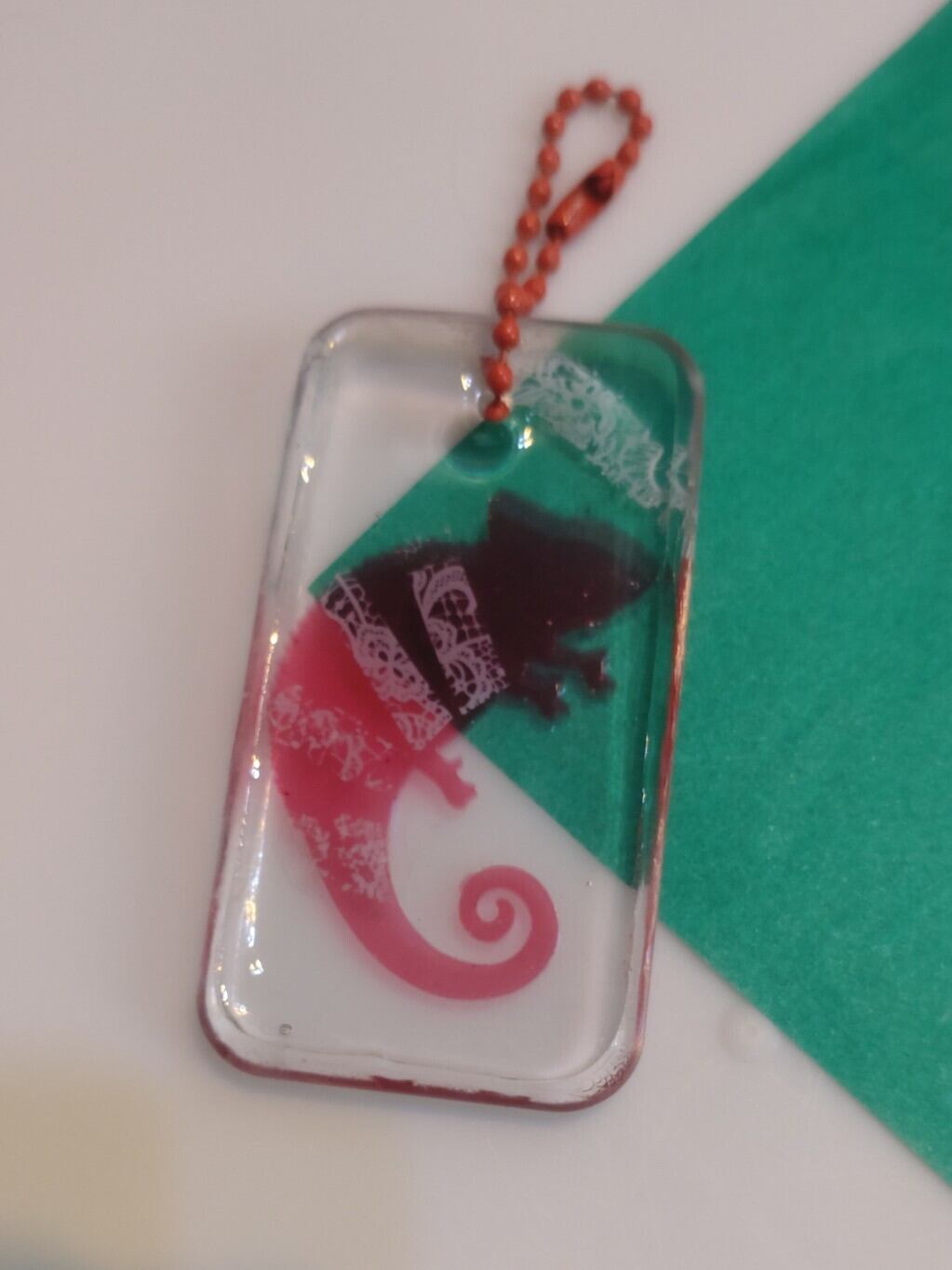 カメレオンのキーチェーンです。 本体にレース柄と、周囲にもレースを配置しました。 透明感ある仕上がりです。 大きさ6.5×3.5cm