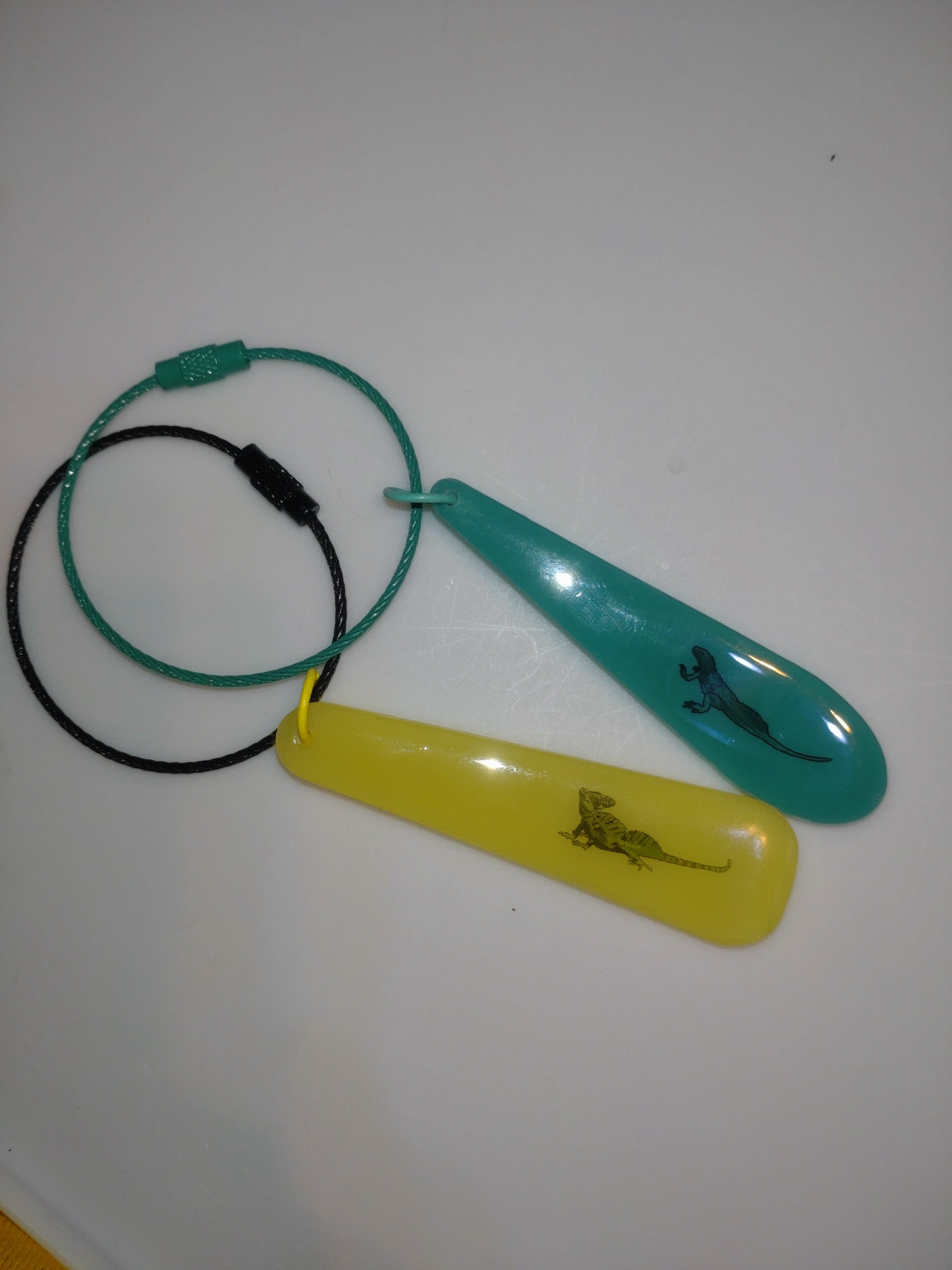 バータイプを使用したイグアナ封入のキーホルダーです。 裏面は無地です。 バーに合わせてワイヤーキーホルダーも緑です。 バータイプチャーム長さ: 7cm